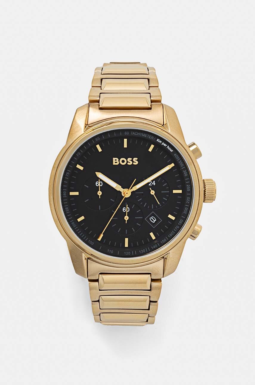 Η Boss δημιούργησε ένα μοντέρνο ανδρικό ρολόι, χρονογράφος. Για την κάσα του χρησιμοποιήθηκε ανοξείδωτο ατσάλι σε χρυσό χρώμα, ενώ το καντράν είναι ανάγλυφο σε μαύρο χρώμα, με χρυσούς δείκτες και σημεία. Για το πιάσιμο του ρολογιού η Boss, διάλεξε μπρασελέ, από ανοξείδωτο ατσάλι σε χρυσό χρώμα.
